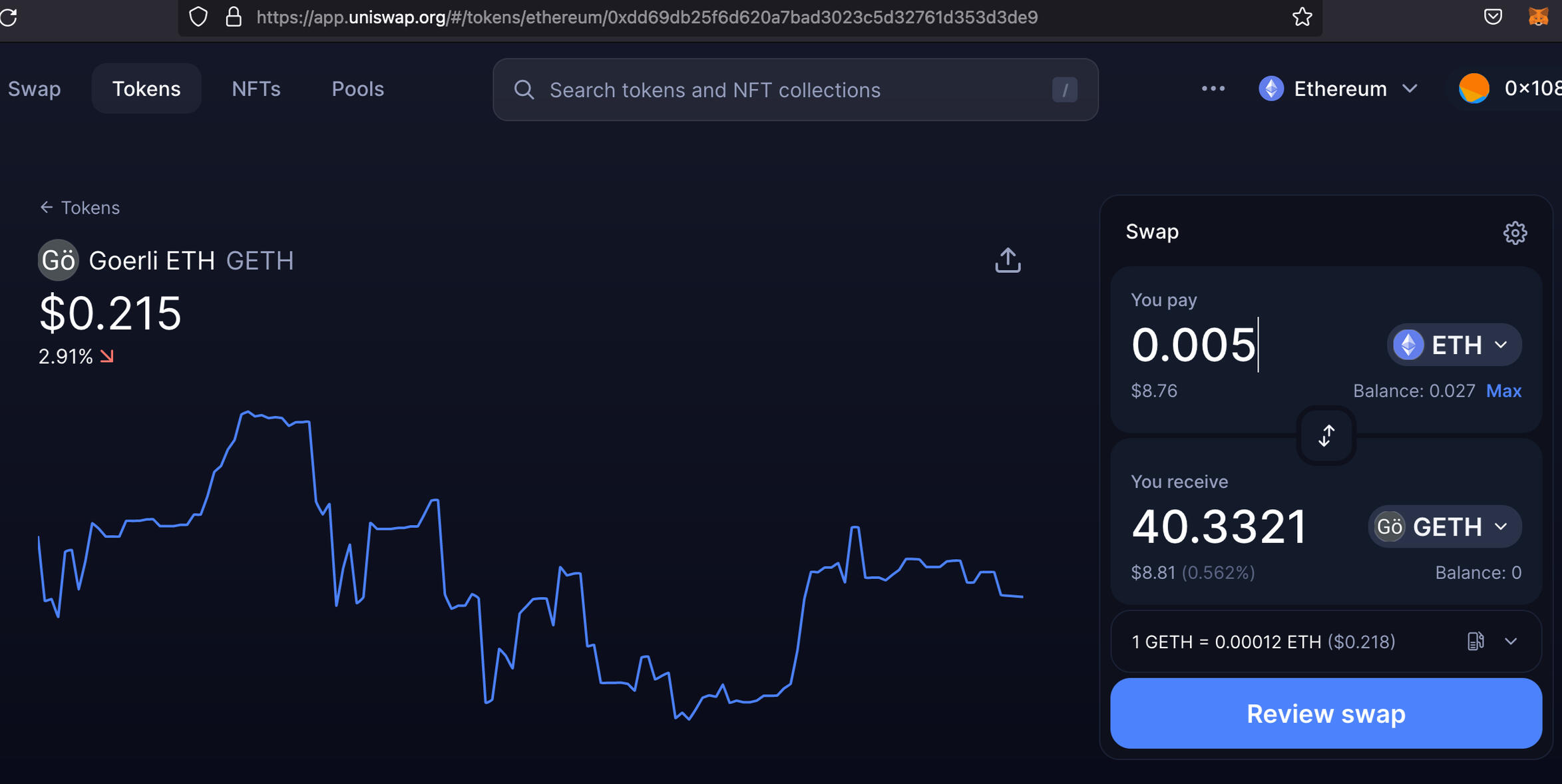 1. Swap assets to gETH. We'll use Uniswap to swap ETH to gETH (link to Uniswap)
